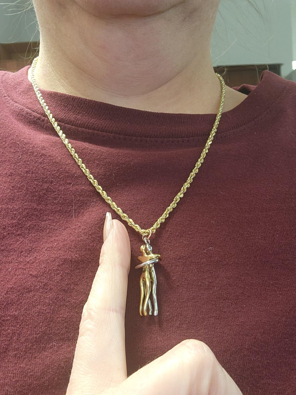 Simply gently toggle the pendant, and the two figures will smoothly approach and hug tightly.
